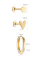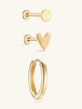 This 14K solid-gold trio brings together a flat disc, a smooth heart, and a classic hoop, each designed with gentle curves and a comfortable fit for sensitive skin. Soft shine, minimal form, and effortless wear for every day.