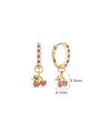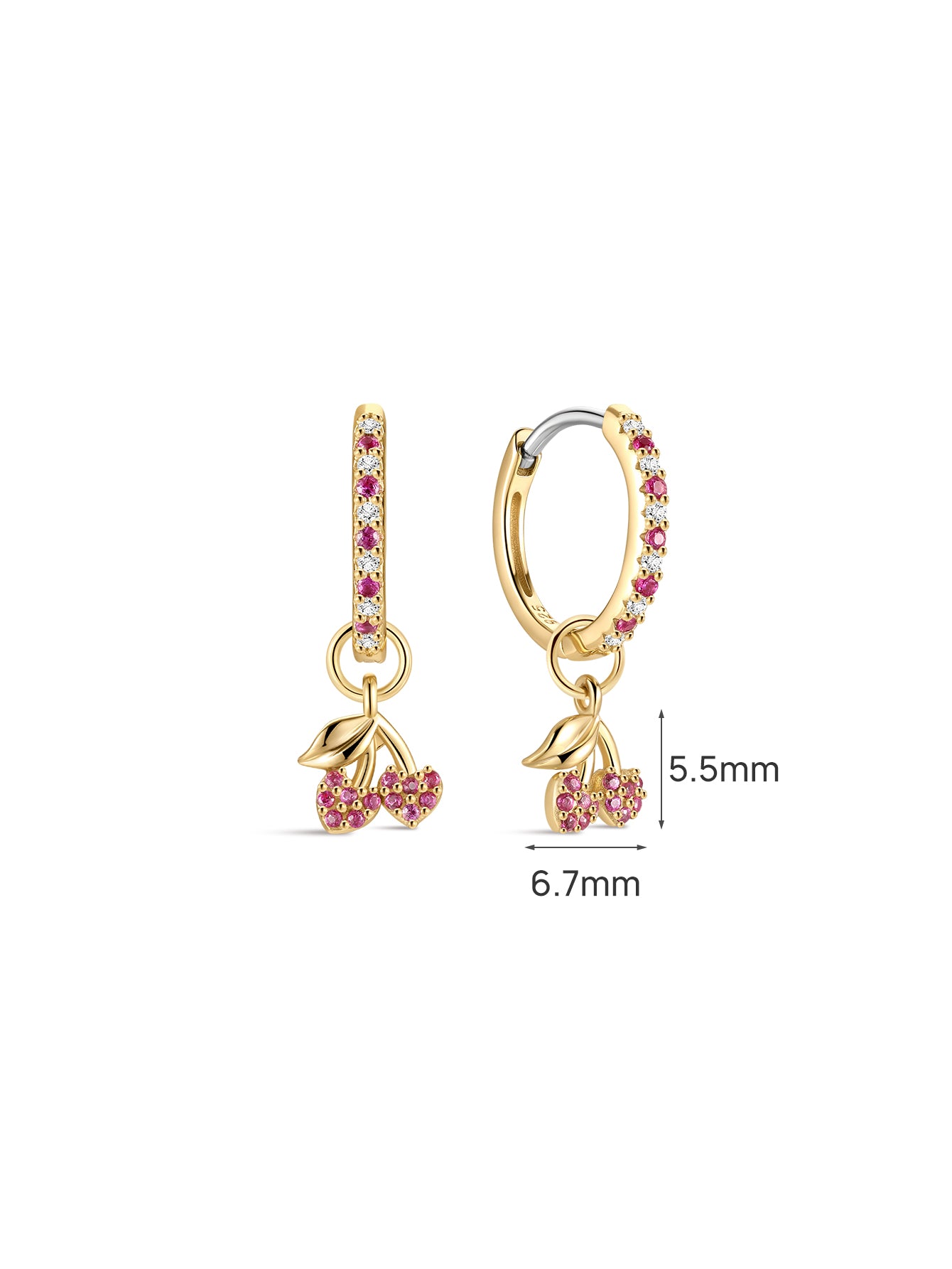 A classic motif, elevated. The Cherry Hoop Earrings feature a slim pavé-set hoop paired with sculpted cherry charms that gently move with you. The vertical stone-lined bar adds structure and sparkle, while the twin cherry drops introduce softness and playful dimension. Crafted from 925 sterling silver and finished in 18K gold plating, these hoops balance refined detailing with everyday versatility. Designed with a secure clicker closure and titanium post upgrade for enhanced comfort and sensitive-skin friendly