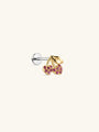 Sweet, but structured. The Cherry Flat Back Stud reinterprets the classic twin-cherry motif through dimensional form and precision stone setting. Each heart-shaped cherry is pavé-set with vibrant pink stones, creating depth and a saturated, light-catching surface. A polished gold stem and leaf add contrast and architectural balance. Crafted in 925 sterling silver and finished with 18K gold plating, this internally threaded flat-back design ensures a secure and comfortable fit for daily wear. Compact yet expressive, it works beautifully in lobe, helix, or cartilage placements. The titanium post upgrade offers a solid, no-plating alternative that is extra durable and ideal for sensitive skin while maintaining the refined gold appearance.