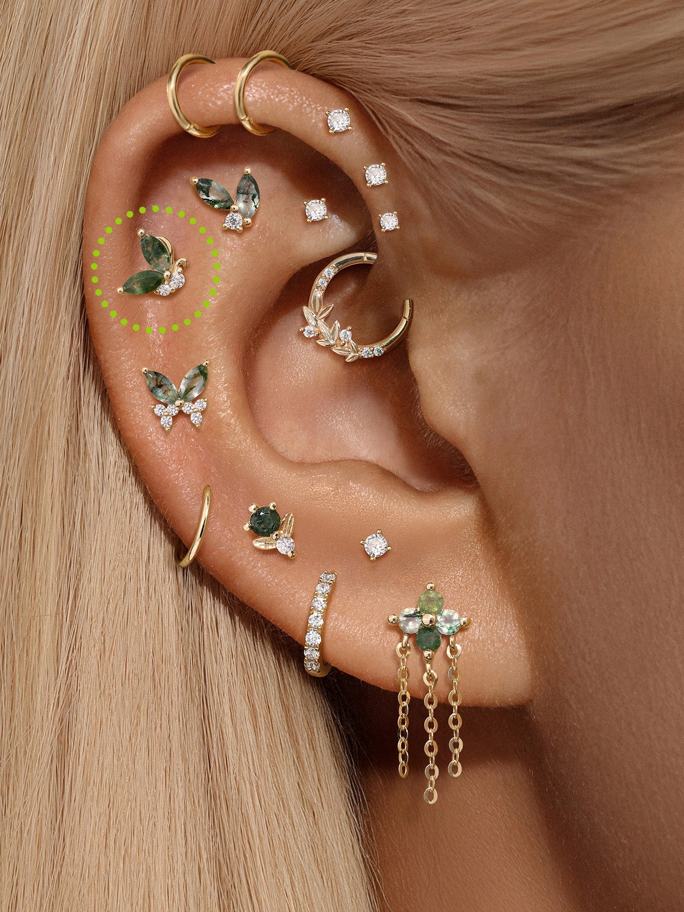 14K Solid Gold Butterfly Moss Agate Flatback Stud