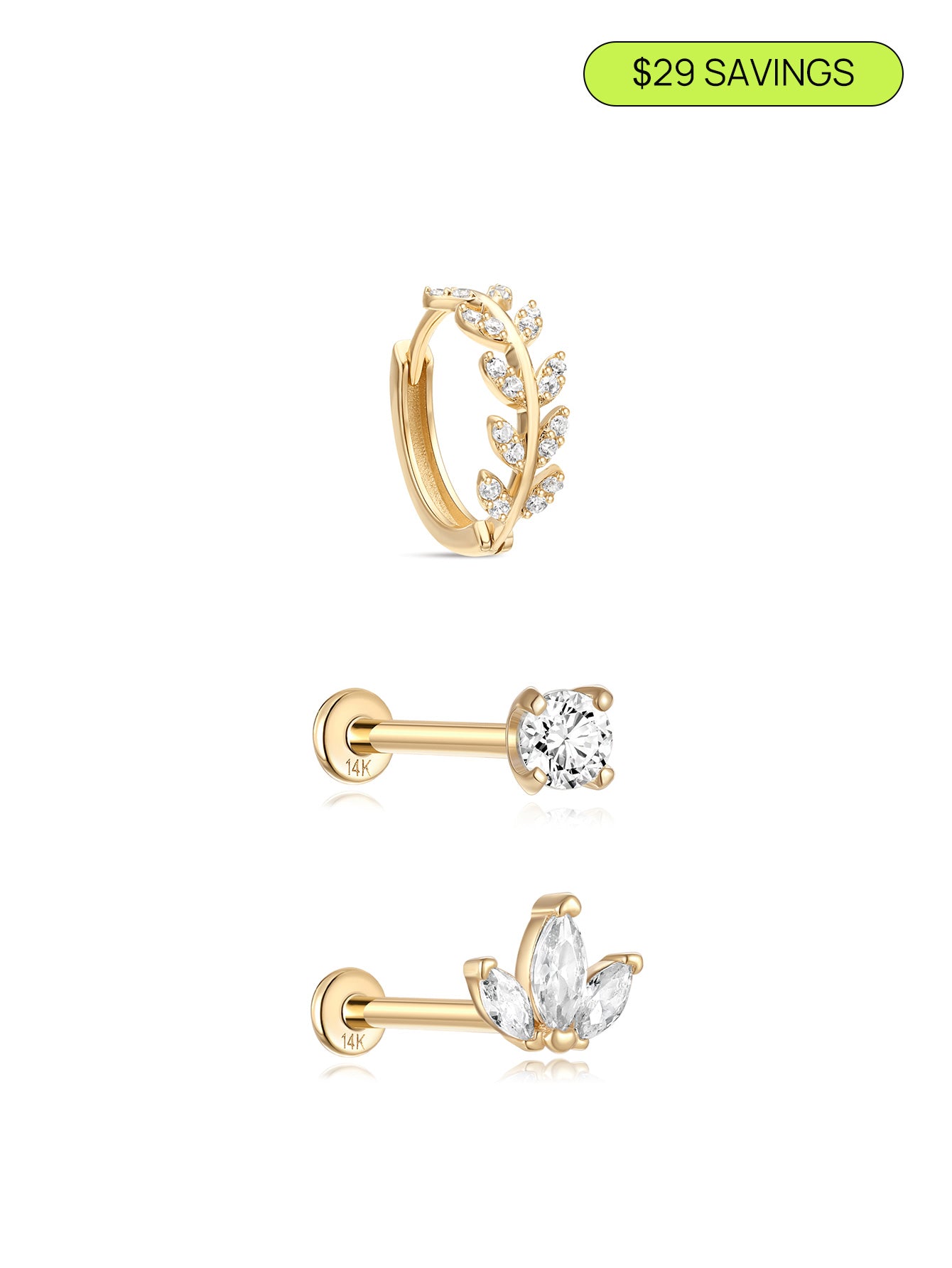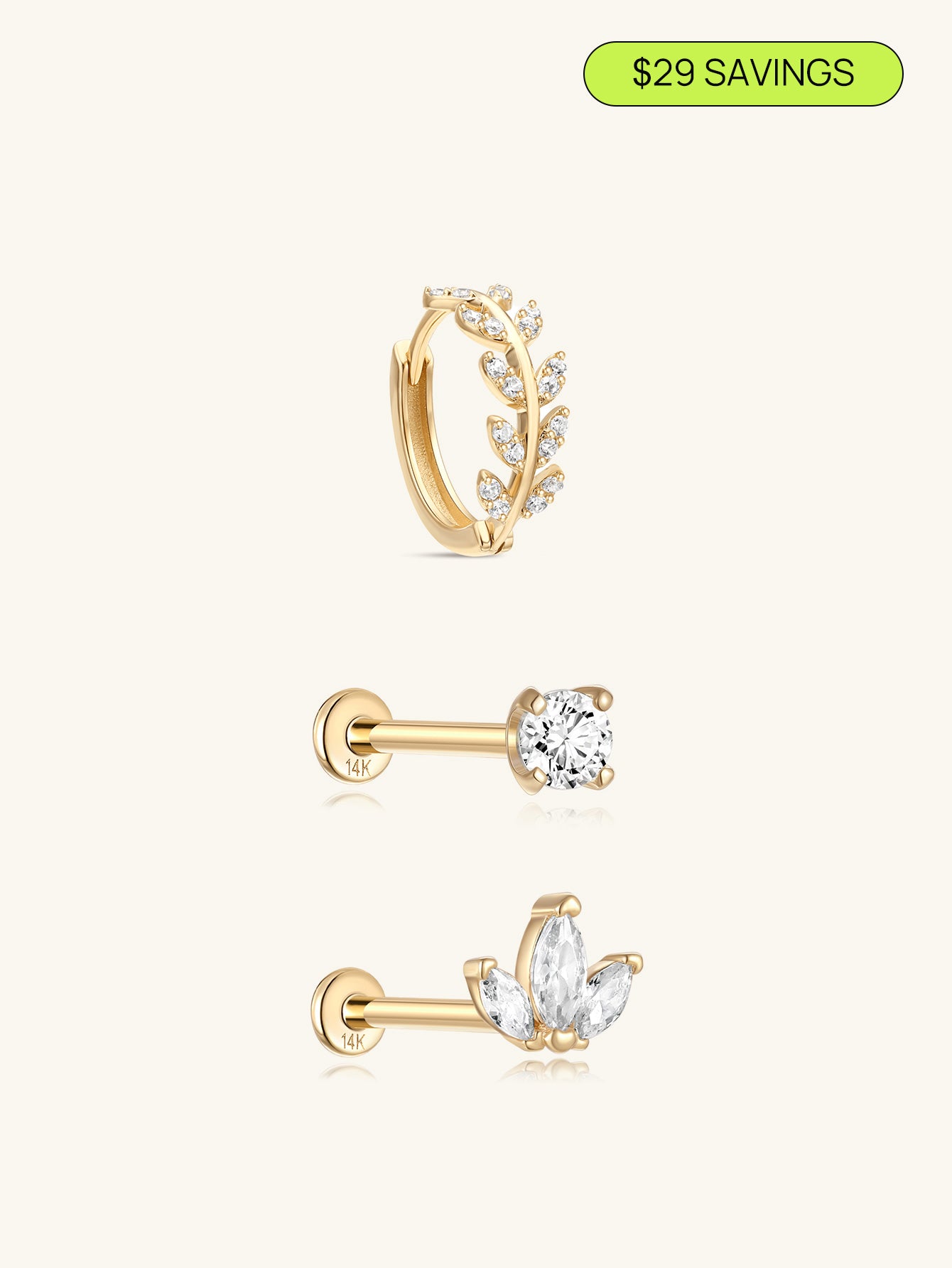 14K Solid Gold 3 Flat Back Sparkle Set with Zircon