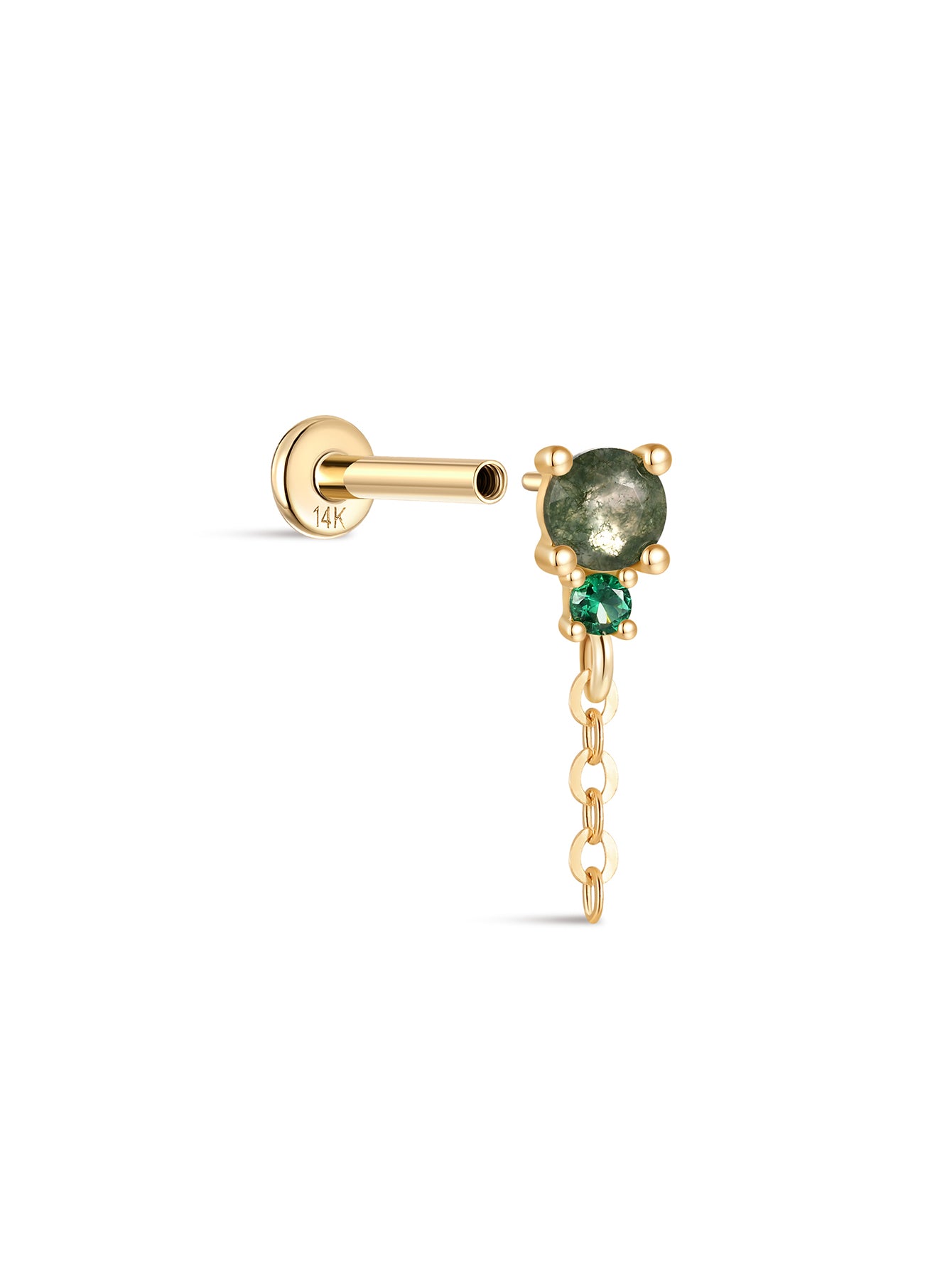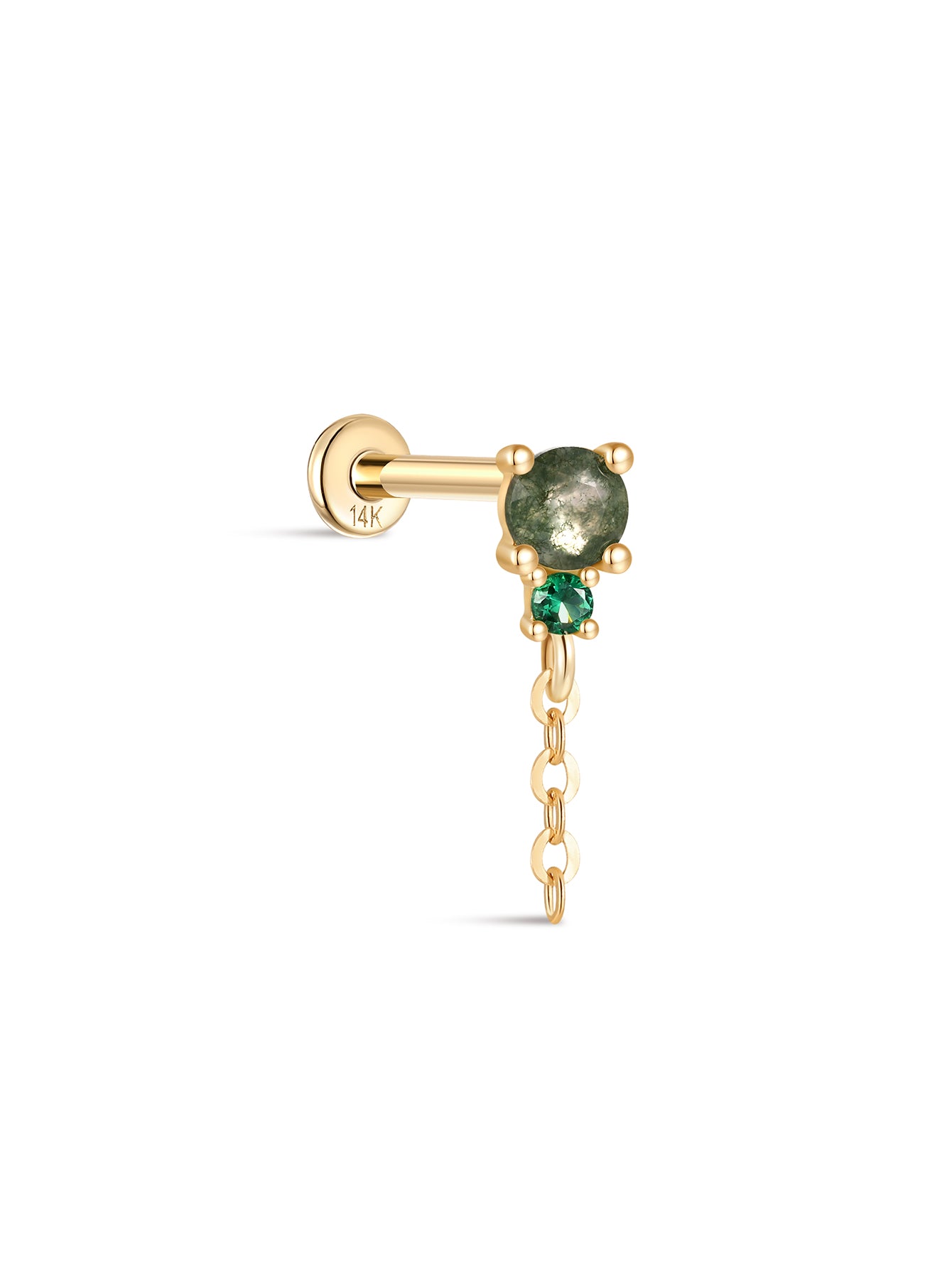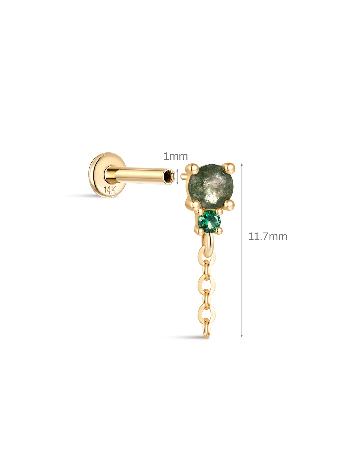 14K Solid Gold Shiny Moss Agate Tassel Flatback Stud