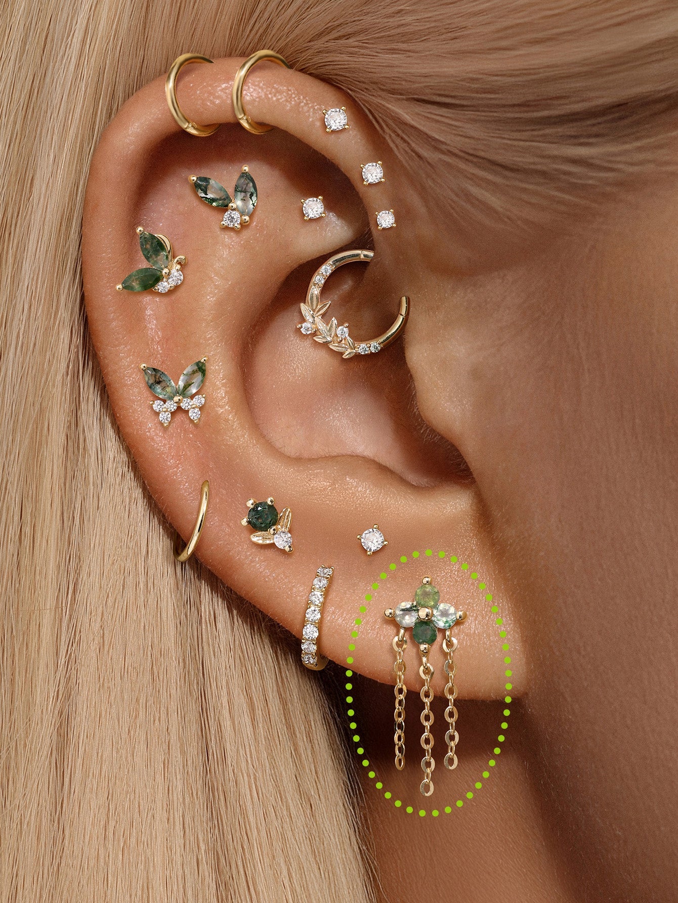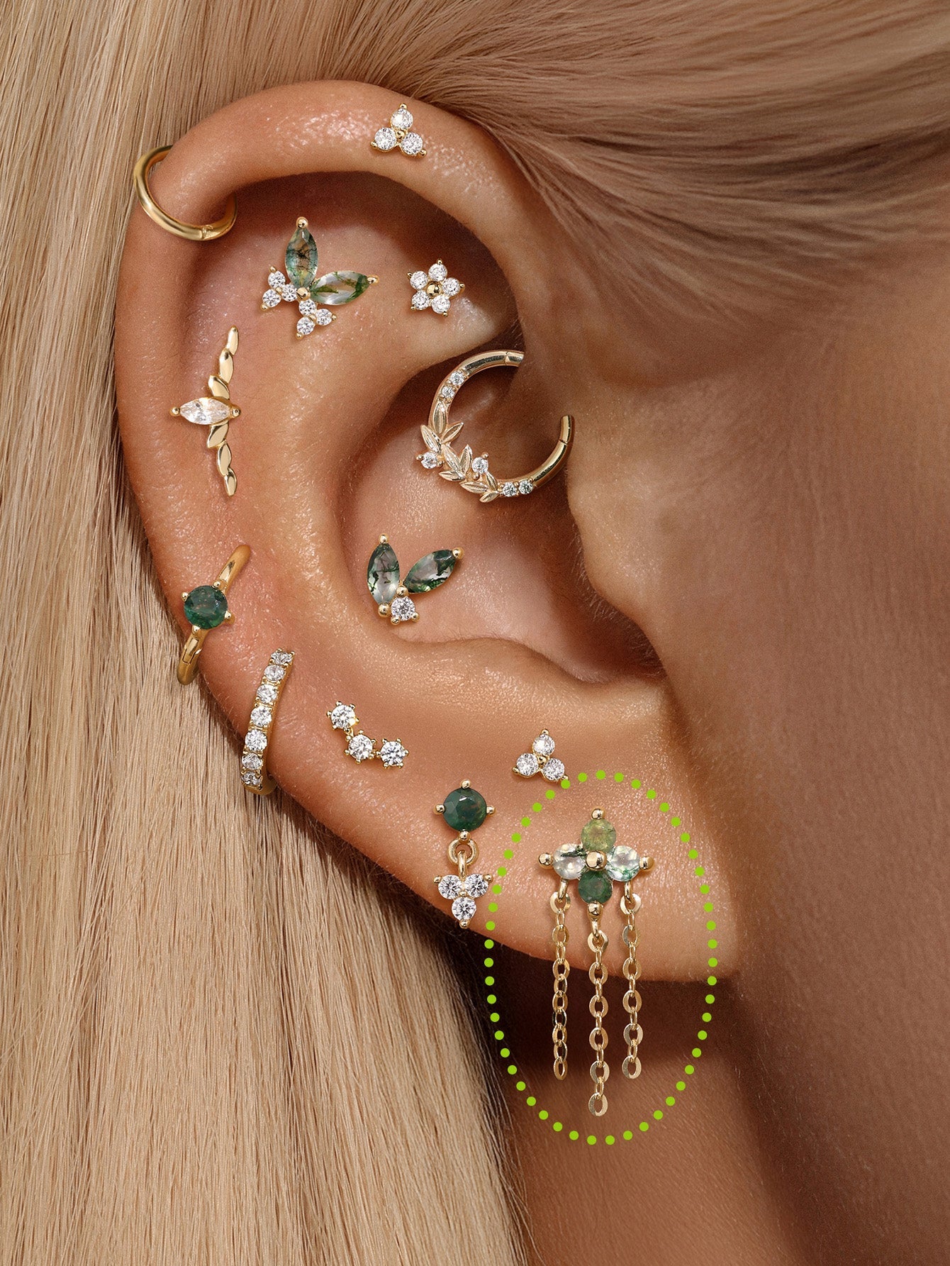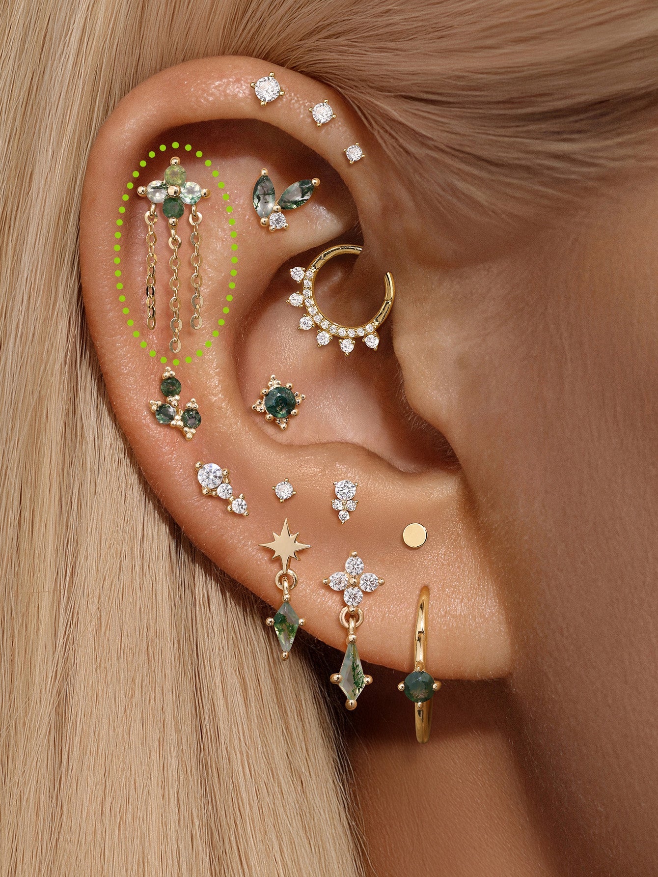 14K Solid Gold Moss Agate Flower Tassel Flatback Stud